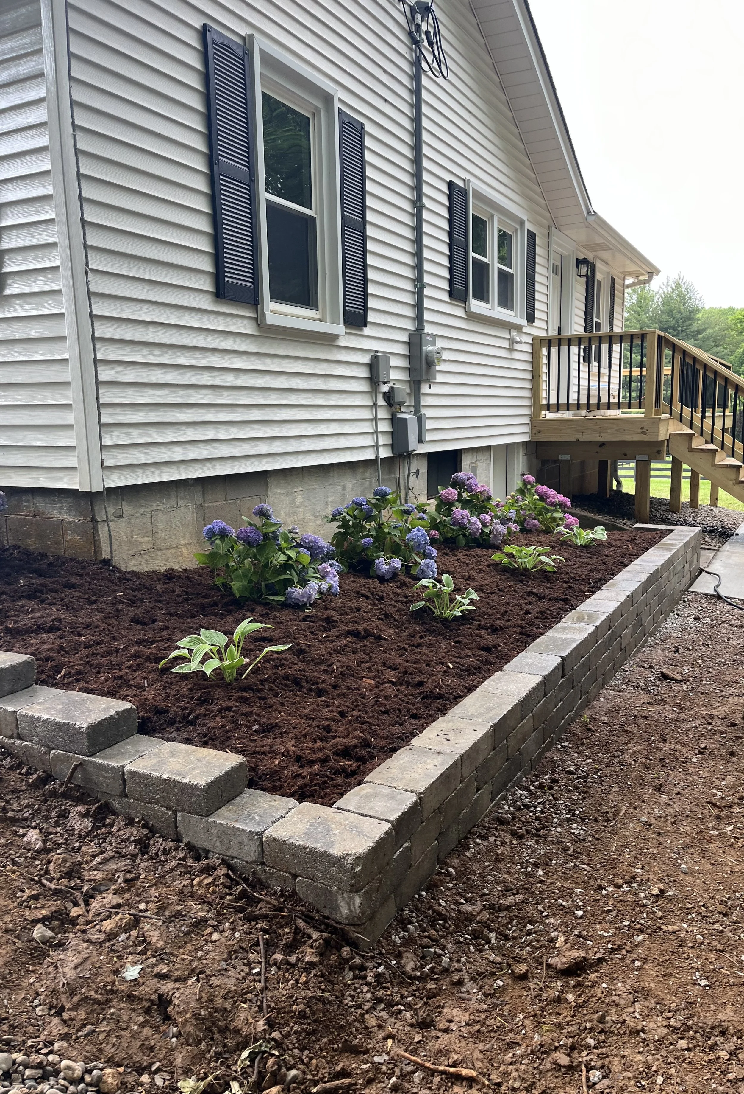 • A large brick house with a manicured lawn and striped grass pattern surrounds it, located in a suburban neighborhood with other houses and trees. A sidewalk runs along the street, and there's a children's playset in the backyard.